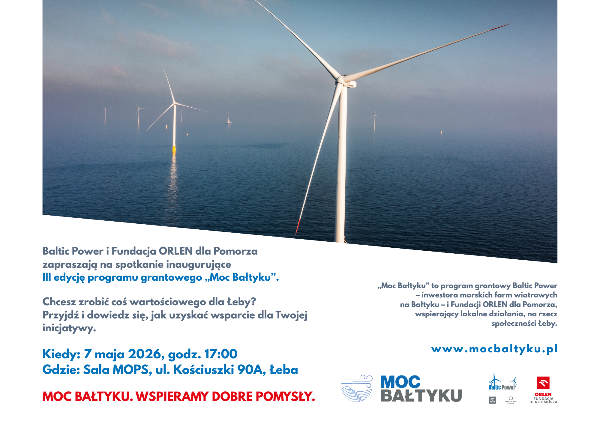 Baltic Power i Fundacja ORLEN dla Pomorza zapraszają na spotkanie inaugurujące III edycję programu grantowego "Moc Bałtyku". Program jest jednym z kluczowych działań społecznych realizowanych na obszarze sąsiadującym z powstającą pierwszą polską morską farmą wiatrową i działającą już w Łebie bazą operacyjno-serwisową Baltic Power.